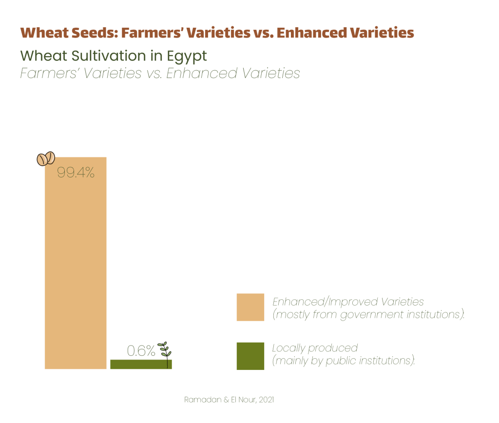 For decades, Egypt’s capacity to produce and exchange seeds has been systematically eroded by agricultural policies that foster dependency and weaken farmers’ ability to reproduce seeds, form cooperatives, or establish local seed banks. Field data show that approximately 99.4percentof wheat cultivated in Egypt relies on improved or hybrid seeds, sourced primarily from state institutions or private companies. In contrast, only 0.6percentof wheat fields are sown with local varieties—a figure that reflects not only the decline of agricultural biodiversity but also the deliberate marginalization of small-scale farmers’ knowledge and local seeds (Ramadan and El Nour, 2021).